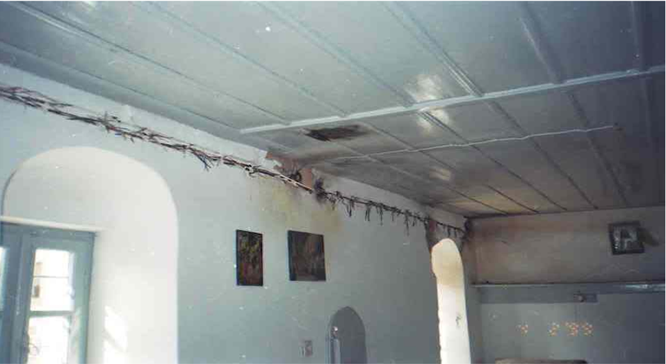 Η περίπτωση αυτή είναι από μοναστήρι, το οποίο δέχτηκε άμεσο κεραυνό και μέρος του κεραυνικού ρεύματος πέρασε στο εσωτερικό. Το ρεύμα του κεραυνού βρήκε αγώγιμο δρόμο στις εσωτερικές καλωδιώσεις, τις οποίες ξήλωσε μέσα από τον τοίχο, σπάζοντας τόσο τους σωλήνες όσο και τους σοβάδες.